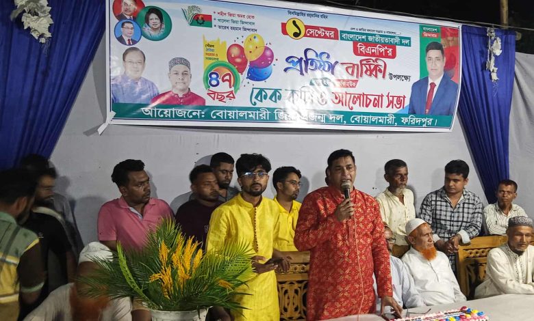 বোয়ালমারী (ফরিদপুর) প্রতিনিধি: ফরিদপুরের বোয়ালমারী উপজেলা জিয়া প্রজন্ম দলের আয়োজনে গত সোমবার সন্ধ্যায় বিএনপির ৪৭তম প্রতিষ্ঠা বার্ষিকী পালন করা হয়েছে। সন্ধ্যায় গুনবাহা কেন্দ্রীয় জিয়া প্রজন্ম দলের সহ-সভাপতি আবুল বাশার বিপ্লবের বাড়িতে নেতাকর্মীদের নিয়ে কেক কেটে প্রতিষ্ঠা বার্ষিকী পালন করা হয়।