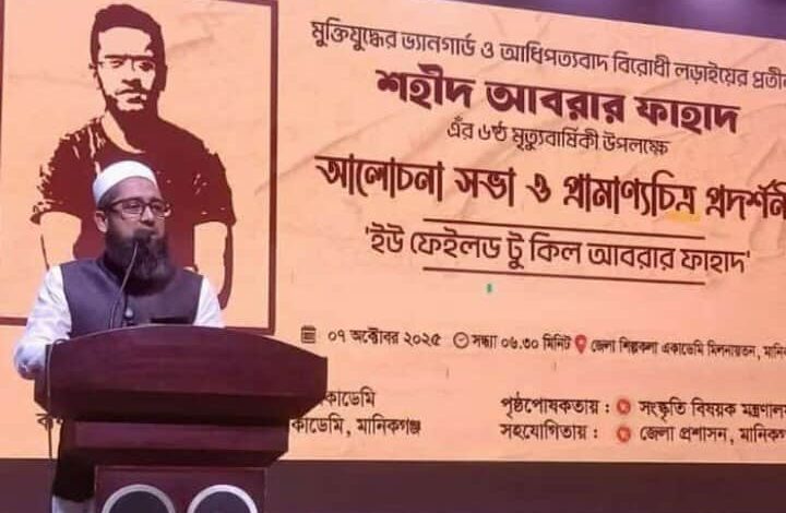মঙ্গলবার (৭ অক্টোবর) সন্ধ্যায় মানিকগঞ্জ জেলা শিল্পকলা একাডেমী মিলনায়তনে আলোচনা সভা ও প্রামাণ্য চিত্র ‘ইউ ফেইলড টু কিল আবরার ফাহাদ’ শীর্ষক প্রামাণ্য চিত্র প্রদর্শিত হয়।