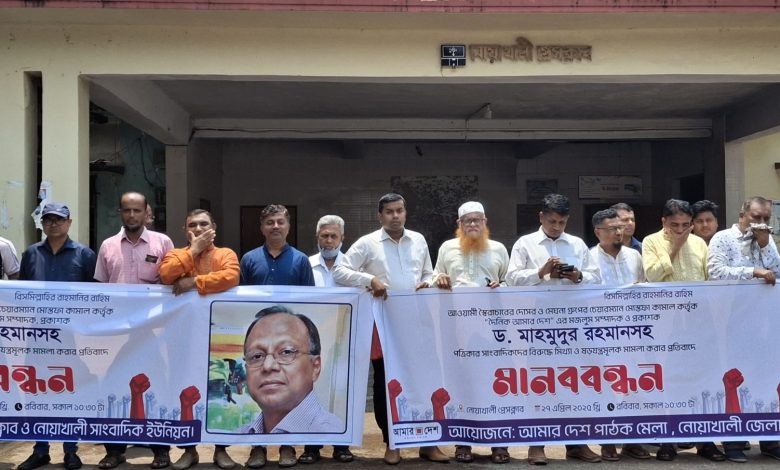 নোয়াখালী প্রতিনিধি: একুশে পদকপ্রাপ্ত দৈনিক আমার দেশের সম্পাদক ডঃ মাহমুদুর রহমানসহ সাংবাদিকদের বিরুদ্ধে ফ্যাসিবাদের দোসর মেঘনা গ্রুপের চেয়ারম্যান মোস্তফা কামাল কর্তৃক মিথ্যা ও হয়রানি মূলক মামলা করার প্রতিবাদে ও তার বিরুদ্ধে দ্রুত আইনানুগ ব্যবস্থা গ্রহণের দাবিতে নোয়াখালী প্রেসক্লাবের সামনে ঘন্টা ব্যাপী মানববন্ধন কর্মসূচি পালিত হয়েছে।