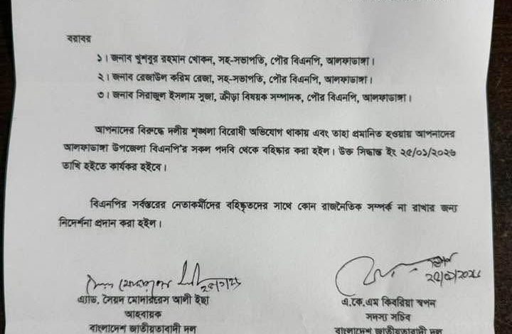 চিঠিতে উল্লেখ করা হয়, সংসদ নির্বাচনে দলীয় প্রার্থীর বিরুদ্ধে অবস্থান গ্রহণ, স্বতন্ত্র প্রার্থীর সঙ্গে সভা-মিটিং ও যোগাযোগ এবং দলীয় সিদ্ধান্ত অমান্য করার অভিযোগ তদন্তে প্রমাণিত হওয়ায় তাদের আলফাডাঙ্গা উপজেলা ও পৌর বিএনপির সকল পর্যায়ের পদ থেকে অব্যাহতি দেওয়া হয়েছে। বহিষ্কারাদেশ জারির সঙ্গে সঙ্গেই তা কার্যকর করা হয়েছে এবং দলীয় নেতাকর্মীদের বহিষ্কৃতদের সঙ্গে কোনো ধরনের রাজনৈতিক সম্পর্ক না রাখার নির্দেশ দেওয়া হয়েছে।