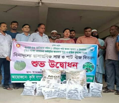 রতন ঘোষ, কটিয়াদী প্রতিনিধি : কিশোরগঞ্জের কটিয়াদীতে ২০২৫-২৬ অর্থবছরে খরিপ-১ মৌসুমে পাট ফসল আবাদ ও উৎপাদন বৃদ্ধির লক্ষ্যে, প্রনোদনা কর্মসূচির আওতায় ক্ষুদ্র ও প্রান্তিক কৃষকদের মাঝে বিনামূল্যে পাটবীজ ও রাসায়নিক সার বিতরণ কর্মসূচির শুভ উদ্বোধন করা হয়েছে।