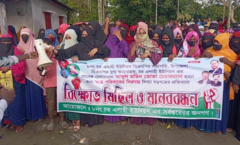 বিএনপি নেতা ইসমাইল হোসেন তোতা অভিযোগ করে বলেন, আওয়ামী সরকারের পতনের পর গত বছরের ২৭ আগস্ট পরিকল্পিত ভাবে কিছু বিএনপি নেতার যোগসাজশে নির্মমভাবে চরএলাহী বাজারে আমার বাবাকে কুপিয়ে হত্যা করা হয়। এরপর জামায়াত থেকে আসা বিএনপি নেতা ফখরুল ইসলামের যোগসাজশে আমাদের পরিবারের একাধিক সদস্যের ওপর হামলা চালানো হয়। মিথ্যা ধর্ষণ মামলায় আমার ছোট ভাই ইব্রাহীম তোতাকে ফাঁসানো হয়। এছাড়াও আমার পরিবারের সদস্যদের নামে মিথ্যা চাঁদাবাজির অভিযোগ তোলা হয়েছে। সকল মিথ্যাচারের প্রতিবাদে চরএলাহী ইউনিয়নের সর্বস্তরের জনগণের ব্যানারে বিক্ষোভ মিছিল ও মানববন্ধনের আয়োজন করা হয়। ওই সময় প্রতিপক্ষের লোকজনের হামলায় এক যুবদল নেতাসহ ৪জন আহত হয়।