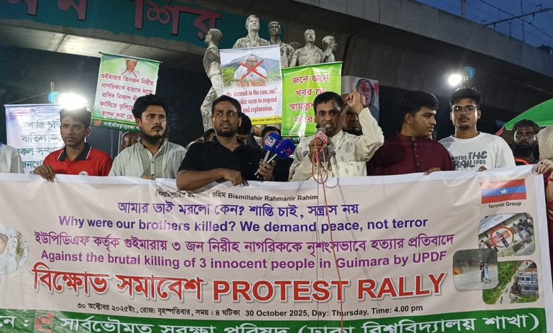 খাগড়াছড়ির গুইমারায় নিরীহ ৩ নাগরিক কে নৃশংসভাবে হত্যার প্রতিবাদে ঢাবিতে বিক্ষোভ সমাবেশ