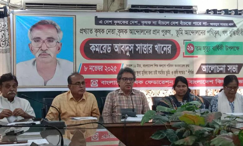 প্রেস বিজ্ঞপ্তি: বাংলাদেশ কৃষক ফেডারেশনের (বিকেএফ) প্রতিষ্ঠাতা সভাপতি, খাসজমি আন্দোলনের কিংবদন্তি নেতা ও মুক্তিযোদ্ধা কমরেড আবদুস সাত্তার খানের ২৯তম মৃত্যুবার্ষিকী উপলক্ষে আজ ৮ নভেম্বর ২০২৫ শনিবার,সকাল ১১টা, ঢাকায় অবস্থিত, বাংলাদেশ শিশুকল্যাণ পরিষদ সম্মেলন কক্ষ,২২/১ তোপখানা রোড ঢাকা-১০০০ এ এক স্মরণসভা অনুষ্ঠিত হয়।