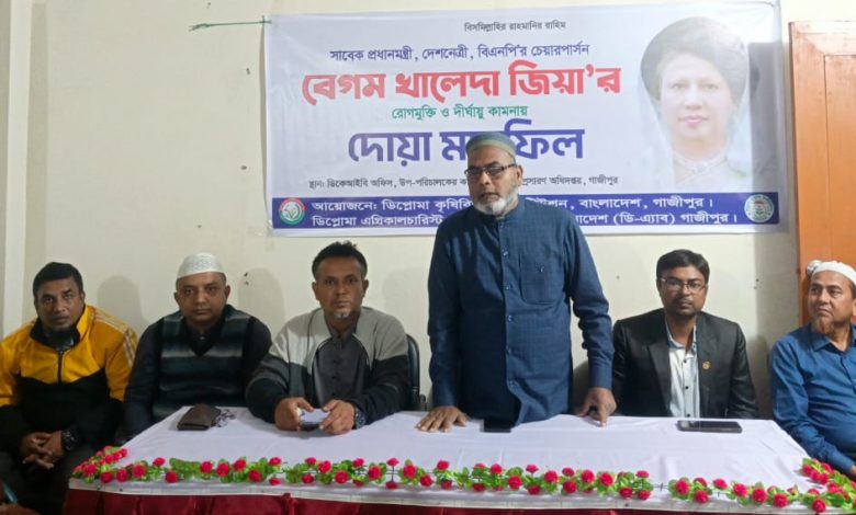 গাজীপুর প্রতিনিধি: ডিপ্লোমা কৃষিবিদ ইনস্টিটিউশন বাংলাদেশ, গাজীপুর ও ডিপ্লোমা এগ্রিকালচারিস্ট এসোসিয়েশন অব বাংলাদেশ, গাজীপুর জেলা শাখার যৌথ আয়োজনে সাবেক তিনবারের প্রধানমন্ত্রী বেগম খালেদা জিয়ার রোগমুক্তি ও দীর্ঘায়ু কামনায় দোয়া মাহফিল অনুষ্ঠিত হয়েছে।