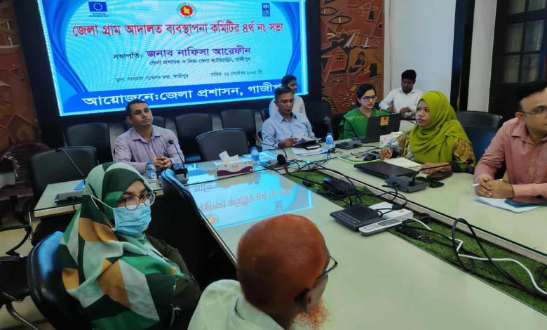 আলমগীর হোসেন,গাজীপুর প্রতিনিধি: গাজীপুর জেলা গ্রাম আদালত ব্যবস্থাপনা কমিটির চতুর্থ সভা গতকাল জেলা প্রশাসকের কার্যালয়ে অনুষ্ঠিত হয়। সভায় সভাপতিত্ব করেন জেলা প্রশাসক ও জেলা ম্যাজিস্ট্রেট নাফিসা আরেফিন।