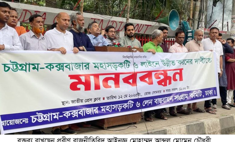 ১২ মে ২০২৫ সোমবার সকাল ১১ টায় জাতীয় প্রেসক্লাবের সামনে চট্টগ্রাম-কক্সবাজার মহাসড়ক ৬ লেন বাস্তবায়ন সংগ্রাম কমিটি, ঢাকার উদ্যোগে চট্টগ্রাম-কক্সবাজার মহাসড়কটি ৬ লেনে উন্নীত করণের দাবিতে মানববন্ধন অনুষ্ঠিত হয়।