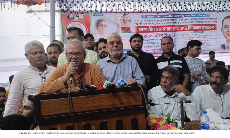 ধামরাই (ঢাকা) প্রতিনিধি: বিএনপির সিনিয়র যুগ্ম মহাসচিব রুহুল কবির রিজভী বলেছেন, যারা চাঁদাবাজি দখলবাজী ও সন্ত্রাসের সাথে জড়িত তারা বিএনপির সদস্য হতে পারবে না। বৃহস্পতিবার বিকেলে ঢাকার ধামরাইয়ের শরীফবাগ শরীফুন নেছা মহিলা দাখিল মাদ্রাসা মাঠে বিএনপির নতুন সদস্য সংগ্রহ ও সদস্য নবায়ন কর্মসূচি উদ্বোধন এবং দেশ ও গণতন্ত্র বিরোধী অপশক্তি দ্বারা বিএনপির ভারপ্রাপ্ত চেয়ারম্যান তারেক রহমান ও তার পরিবারের সদস্যদের নিয়ে অশালীন প্রচারণার প্রতিবাদে বিক্ষোভ সমাবেশে প্রধান অতিথির বক্তব্যে এ কথা বলেন।