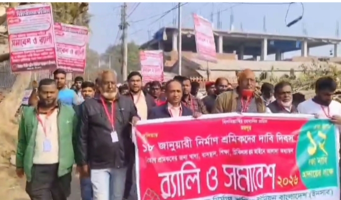 শিবগঞ্জ (চাঁপাইনবাবগঞ্জ) সংবাদদাতা: ২০২৬-২৭ অর্থবছরের বাজেটে অর্থ বরাদ্দ করে মৌলিক অধিকারসহ ১২ দফা দাবি বাস্তবায়নের লক্ষে চাঁপাইনবাবগঞ্জে র্যালি ও সমাবেশ করেছে ইমারত নির্মাণ শ্রমিক ইউনিয়ন।
