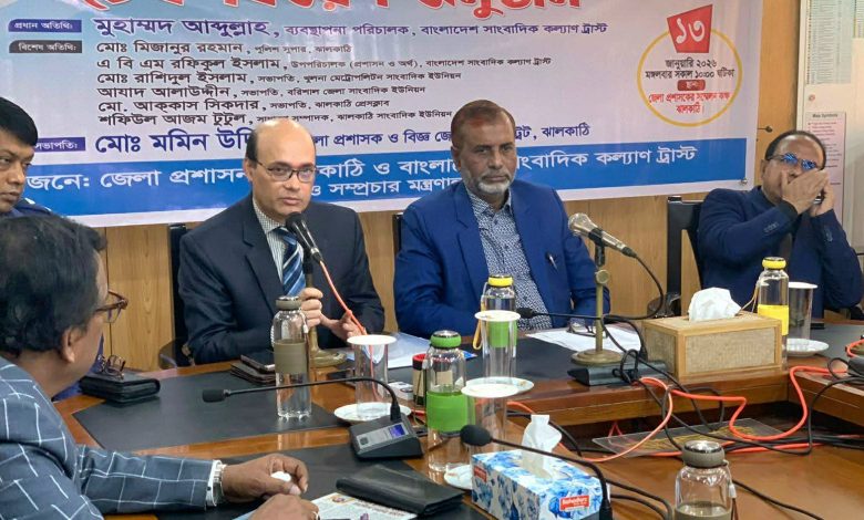 মো:শাহাদাত হোসেন মনু, ঝালকাঠি: ঝালকাঠিতে পেশাগত ঝুঁকি ও আর্থিক সংকটে থাকা সাংবাদিকদের সহায়তায় আর্থিক অনুদানের চেক প্রদান করা হয়েছে। মংগলবার (১৩ জানুয়ারি) ঝালকাঠি জেলা প্রশাসক এর সম্মেলন কক্ষে বাংলাদেশ সাংবাদিক কল্যাণ ট্রাস্ট আয়োজিত এক অনুষ্ঠানে বরিশাল বিভাগের চার জেলার মোট ৩০ জন সাংবাদিকের হাতে চেক তুলে দেন প্রধান অতিথি বাংলাদেশ সাংবাদিক কল্যাণ ট্রাস্টের ব্যবস্থাপনা পরিচালক (এমডি) মুহাম্মদ আবদুল্লাহ। সভাপতিত্ব করেন ঝালকাঠির জেলা প্রশাসক মমিন উদ্দিন।