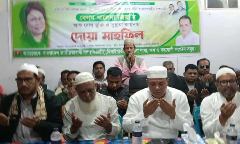 এ সময় উপজেলা বিএনপির সদস্য সচিব মো. লুৎফর রহমান, যুগ্ম আহবায়ক মো. আব্দুল মান্নানসহ বিএনপি ও অঙ্গসহযোগী সংগঠনের সর্বস্তরের নেতাকর্মীরা উপস্থিত ছিলেন। দোয়া শেষে দেশনেত্রী বেগম খালেদা জিয়ার দ্রুত সুস্থতা ও দেশের শান্তি-কল্যাণ কামনা করে দোয়া করা হয়।
