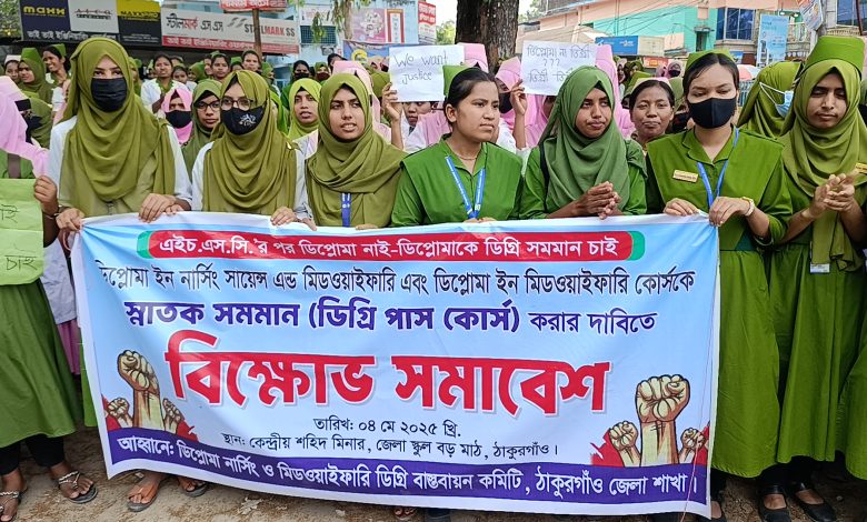 রবিবার দুপুরে ডিপ্লোমা নার্সিং ও মিডওয়াইফারি ডিগ্রি বাস্তবায়ন কমিটি ঠাকুরগাঁও জেলা শাখার আয়োজনে ঠাকুরগাঁও জেলা স্কুল বড় মাঠের কেন্দ্রীয় শহীদ মিনারে এই বিক্ষোভ সমাবেশ ও মানববন্ধন অনুষ্ঠিত হয়।