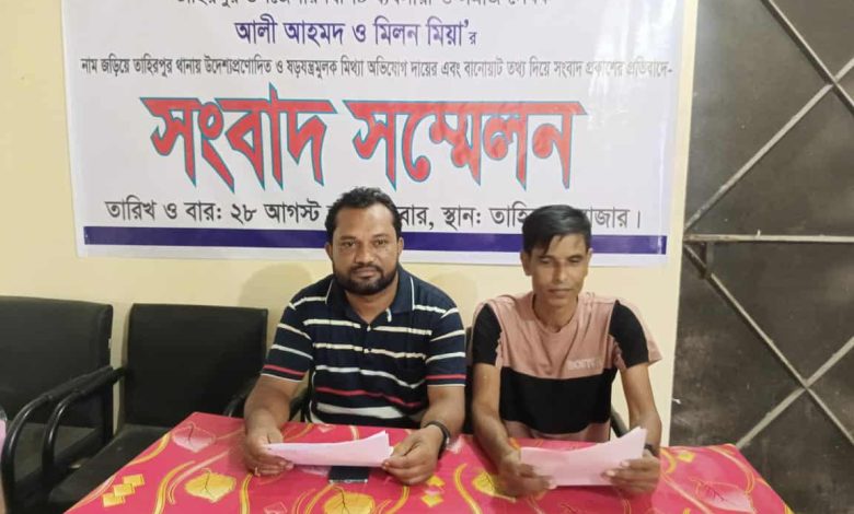 সংবাদ সম্মেলনে লিখিত বক্তব্যে আলী আহমদ ও মিলন মিয়া বলেন, গত দুইদিন পূর্বে তাহিরপুর সদর ইউনিয়নের মধ্য তাহিরপুর গ্রামের তানিম আহমদ লিংকন ও লক্ষীপুর গ্রামের হাফিজ উদ্দিনের মধ্যে ব্যক্তিগত দ্বন্দ্ব সংঘটিত হয়। সেই দ্বন্দ্বকে কেন্দ্র করে গতকাল (২৭ আগস্ট) বুধবার পূর্ব শুত্রুতা ও রাজনৈতিক বিরোধের জেরে আমাকে (আলী আহমদ) ও মিলন মিয়াকে জড়িয়ে তাহিরপুর থানায় তানিম আহমদ লিংকন নামের এক চিহ্নিত মাদক ব্যবসায়ী ষড়যন্ত্রমূলক মিথ্যা ও ভিত্তিহীন অভিযোগ দায়ের করে। এবং আমাদের পরিবারের সম্মান বিনষ্ট করতে বিভিন্ন পত্র-পত্রিকায় মিথ্যা তথ্য দিয়ে উদ্দেশ্য প্রণোদিত ভাবে সংবাদ প্রকাশ করা হয়। যা আমাদের পরিবারকে সামাজিক ও রাজনৈতিক ভাবে হেয় করা হচ্ছে। আমরা এর তীব্র নিন্দা ও প্রতিবাদ জানাই। মুলত তানিম আহমদ লিংকন নিজেই চাঁদাবাজি ও সন্ত্রাসী কর্মকাণ্ডে জড়িত। সে একজন নিয়মিত মাদকাসক্ত ও মাদক ব্যবসায়ী। যা সামাজের বিভিন্ন শ্রেণী পেশার মানুষ অবগত আছেন। তারা আরও বলেন, এ ধরনের অভিযোগ ও সংবাদ প্রকাশ সম্পূর্ণ মিথ্যা, বানোয়াট ও উদ্দেশ্যপ্রণোদিত। এর সঙ্গে বাস্তবতার কোনো সম্পর্ক নেই। আমরা মনে করি এটি একটি সুপরিকল্পিত ষড়যন্ত্র, যাতে সমাজসেবামূলক কার্যক্রম ও ব্যবসায়িক সুনাম বিনষ্ট করা হয়। তিনি বলেন, প্রশাসনের প্রতি অনুরোধ, প্রকৃত ঘটনা তদন্ত করে সত্যতা যাচাইয়ের মাধ্যমে আইনগত ব্যবস্থা গ্রহণ করা হোক। প্রকৃতপক্ষে এই ঘটনার সাথে যারা জড়িত তাদের আইনের আওতায় আনা হোক। এবং আমাদের উপর আনা মিথ্যা মামলা ও অভিযোগগুলো অবিলম্বে তদন্ত সাপেক্ষে বাতিল করা হউক। এবং বানোয়াট তথ্য দিয়ে সংবাদ প্রচারকারীদের বিরুদ্ধে আইনগত ব্যবস্থা গ্রহণ করা হউক।