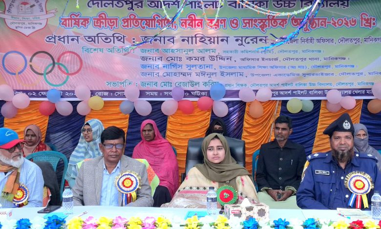 কাউছার মিয়া, দৌলতপুর(মানিকগঞ্জ) প্রতিনিধি: দৌলতপুর পাইলট বালিকা উচ্চ বিদ্যালেয় বার্ষিক ক্রীড়া প্রতিযোগিতা নবীন বরণ ও সাংস্কৃতি অনুষ্ঠান ২০২৬ অনুষ্ঠিত হয়েছে।