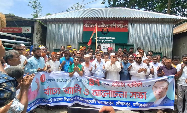 কাউছার আহমেদ, দৌলতপুর প্রতিনিধি: মানিকগঞ্জের দৌলতপুর উপজেলায় বিএনপির ৪৭তম প্রতিষ্ঠাবার্ষিকী উপলক্ষে আনন্দ র‌্যালি করেছে দৌলতপুর উপজেলা বিএনপি। মিছিলে দৌলতপুর উপজেলার বিএনপি ও অঙ্গ সংগঠনের প্রায় নেতাকর্মী সমবেত হন।