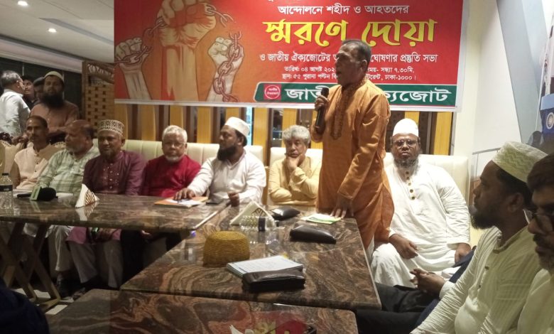 বাংলাদেশ ইসলামী জনকল্যাণ পার্টির চেয়ারম্যান মাওলানা আলতাফ হোসেন মোল্লার সভাপতিত্বে বাংলাদেশ মুসলিম সমাজের চেয়ারম্যান মোঃ মাসুদ হোসেনের পরিচালনায় বিভিন্ন রাজনৈতিক দলের নেতৃবৃন্দ বলেন, জুলাই ছাত্র জনতার আত্মত্যাগের বিনিময়ে তীব্র গণআন্দোলনের মুখে ৫ই আগস্টে ফ্যাসিবাদিদের পলায়নে বাধ্য হওয়ার পর জনগণ নতুন বাংলাদেশ গড়ার স্বপ্ন দেখে। দুঃখের বিষয় সেই স্বপ্ন আজ দুঃস্বপ্নে পরিণত চলেছে। এর প্রকৃত কারণ বর্তমান অন্তর্বর্তীকালীন সরকারের গুরুত্বপূর্ণ অনেক জায়গায় ফ্যাসিবাদীদের দোসররা ঘাপটি মেরে বসে আছে। তারা দেশকে অকার্যকর ব্যর্থ রাষ্ট্র পরিণত করতে চায়। আর এই নির্দেশনা আসে স্বাধীনতার পর থেকে অদ্যবধি যেই দেশ আমাদেরকে শোষণ করে যাচ্ছে। তাদের থেকে এই দেশের কিছু কুলাঙ্গারা সর্বদাই তাদের নির্দেশনা বাস্তবায়নের চেষ্টা চালিয়ে যাচ্ছে। এদেরকে চিহ্নিত করে আইনের কাছে সোপর্দ করতে হবে।