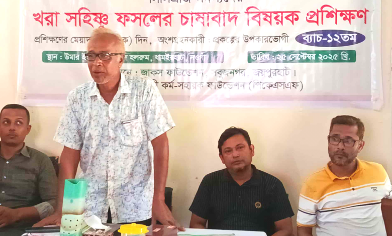 প্রশিক্ষণ বিষয়ে প্রকল্প সমন্বয়কারী মোঃ শরিফুল ইসলাম বলেন, ‘এই প্রশিক্ষণের উদ্দেশ্য হচ্ছে মাঠ পর্যায়ে কৃষকরা খরা সহিষ্ণু ফসল কিভাবে চাষাবাদ করবেন সে সম্পর্কে সম্মুখ জ্ঞান বা ধারণা প্রদান করা। আমরা আশাকরি কৃষক ভাইয়েরা এই প্রশিক্ষণ গ্রহণ করে খরা সহিষ্ণু ফসল উৎপাদনে আরো বেশি আগ্রহী হবেন এবং পানির সঠিক ব্যবহার নিশ্চিত করবেন। এ প্রশিক্ষণ কর্মসূচি পল্লী কর্ম সহায়ক ফাউন্ডেশন (পিকেএসএফ) এর সহযোগিতায় জাকস ফাউন্ডেশন, সবুজনগর, জয়পুরহাট বাস্তবায়ন করছে।