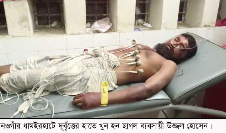 ধামইরহাট (নওগাঁ) প্রতিনিধি : নওগাঁর ধামইরহাটে দূর্বৃত্তের হামলায় এক ছাগল ব্যবসায়ী খুন হয়েছে। ২৪ এপ্রিল দিবাগত রাত সাড়ে ৯ টার দিকে বড়থা বাজার থেকে বাড়ী ফেরার পথে দূর্বৃত্তের হামলার শিকার হন ছাগল ব্যবসায়ী উজ্জল হোসেন। হামলার পর পরই স্থানীয়রা তাকে পত্নীতলা স্বাস্থ্য কমপ্লেক্সে নিলে জরুরী বিভাগের কর্তব্যরত চিকিৎসক বংশিবাটি গ্রামের সাইদুল ইসলামের ছেলে মো. উজ্জল হোসেন (৩০) কে মৃত ঘোষণা করেন। স্থানীয়রা তাকে সন্ধার পর বড়থা বাজারে দেখেছেন এবং সে বিভিন্ন গ্রামে ও হাটে ছাগল ব্যবসা করতেন বলে জানান।