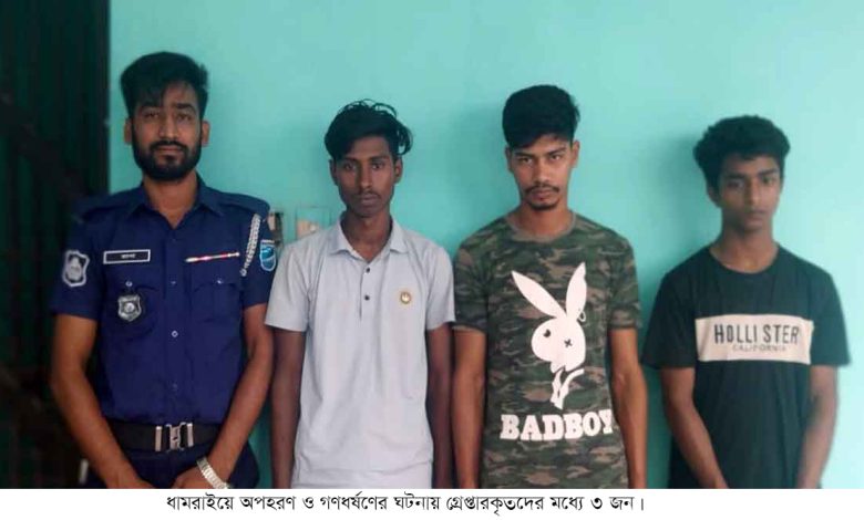 ধামরাই (ঢাকা) প্রতিনিধি: ঢাকার ধামরাইয়ে চতুর্থ শ্রেণির এক স্কুলছাত্রীকে অপহরণের পর গণধর্ষণের অভিযোগে মহিলা সহযোগীসহ ৪ জনকে গ্রেপ্তার করেছে পুলিশ। গতকাল বুধবার ভোর রাতে সাভারের আশুলিয়া থানার নবীনগর বটতলা এলাকায় অভিযান চালিয়ে অপহৃত স্কুলছাত্রীকে উদ্ধারসহ অভিযুক্তদের গ্রেপ্তার করে পুলিশ।