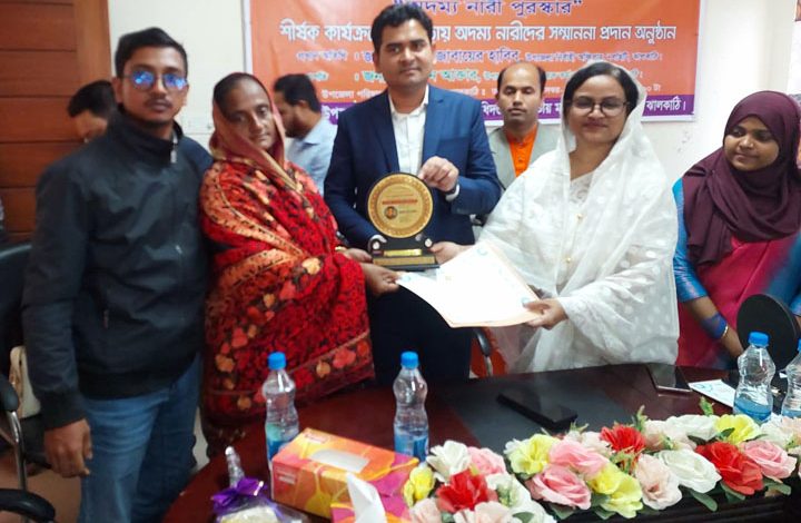 মো:শাহাদাত হোসেন মনু,ঝালকাঠি: “নারী ও কন্যার প্রতি সহিংসতা বন্ধে ঐক্যবদ্ধ হই, ডিজিটাল নিরাপত্তা নিশ্চিত করি”- প্রতিপাদ্য বিষয়কে সামনে রেখে ‘অদম্য নারী পুরস্কার’ শীর্ষক কার্যক্রমের আওতায় ঝালকাঠির নলছিটিতে অদম্য নারীদের সম্মাননা প্রদান করা হয়েছে। অনুষ্ঠানে বক্তব্য রাখেন এবং নির্বাচিত অদম্য নারীদের হাতে সম্মাননা ক্রেষ্ট ও সনদ তুলে দেন প্রধান অতিথি সহকারি কমিশনার (ভুমি) মো. রিজভী আহমেদ সবুজ।
