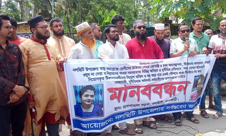 মো.শাহাদাত হোসেন মনু,ঝালকাঠি প্রতিনিধি: ঝালকাঠির নলছিটি উপজেলা স্বাস্থ্য কমপ্লেক্সে চিকিৎসা সেবা, ওষুধ সরবরাহ, খাদ্য ব্যবস্থাপনায় অনিয়ম দুর্ণীতি এবং সেবা নিতে আসা রোগীদের সাথে স্বাস্থ্যকর্মীদের অসদাচরণসহ নানাবিধ অনিয়ম ও দুর্নীতির প্রতিবাদে মানববন্ধন অনুষ্ঠিত হয়েছে।