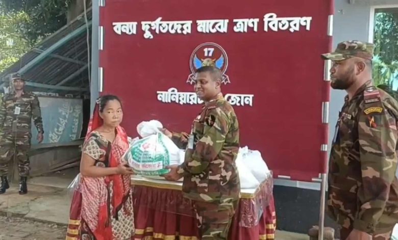 বুধবার সকালে নানিয়ারচর উপজেলার খোলা মাঠে স্থানীয় ৪৫টি দুর্গত পরিবারের মাঝে ত্রাণসামগ্রী ও নগদ সহায়তা বিতরণ করে সেনাবাহিনী। এসময় ১৭ বেঙ্গল ব্যাটালিয়নের জোন অধিনায়ক লে. কর্নেল মশিউর রহমান (পিএসসি) দুর্গত পরিবারের হাতে এসব সহায়তা তুলে দেন।