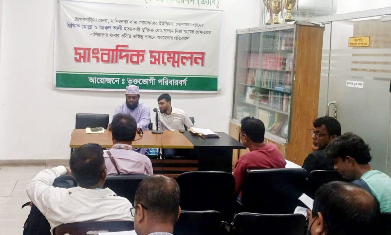 ব্রাহ্মণবাড়িয়া জেলার নাসিরনগর উপজেলার গোয়ালনগর ইউনিয়নের সোনাতলা গ্রামের ছিদ্দিক মোল্লা ও আক্কল আলীর হত্যাকারী খুনিচক্র মোঃ সালাম মিয়া গংয়ের গ্রেফতারে নাসিরনগর থানার ওসি’র দায়িত্ব পালনে অবহেলার প্রতিবাদে ২ জুলাই ২০২৫ বুধবার বাংলাদেশ ক্রাইম রিপোর্টস এসোসিয়েশন (ক্র্যাব) মিলনায়তনে (নিচ তলা) সকাল ১১ টায় সাংবাদিক সম্মেলন অনুষ্ঠিত হয়।