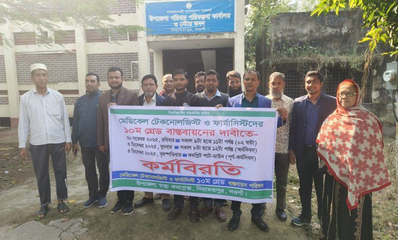 আন্দোলন পরিচালনা করছে,মেডিকেল টেকনোলজিস্ট ও ফার্মাসিস্ট ১০ম গ্রেড বাস্তবায়ন পরিষদ, উপজেলা স্বাস্থ্য কমপ্লেক্স, নিয়ামতপুর, নওগাঁ।