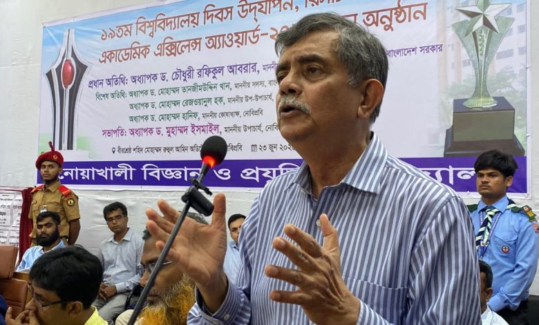 সোমবার (২৩ জুন) দুপুরের দিকে মুহাম্মদ রুহুল আমিন অডিটোরিয়ামে নোয়াখালী বিজ্ঞান ও প্রযুক্তি বিশ্ববিদ্যালয়ের (নোবিপ্রবি) ১৯তম বিশ্ববিদ্যালয় দিবস উদযাপন, রিসার্চ ফেয়ার এবং একাডেমিক এক্সিলেল অ্যাওয়ার্ড অনুষ্ঠানে প্রধান অতিথির বক্তব্যে তিনি এসব কথা বলেন অনুষ্ঠানে সভাপতিত্ব করেন বিশ্ববিদ্যালয়ের উপাচার্য অধ্যাপক ড. মুহাম্মদ ইসমাইল।