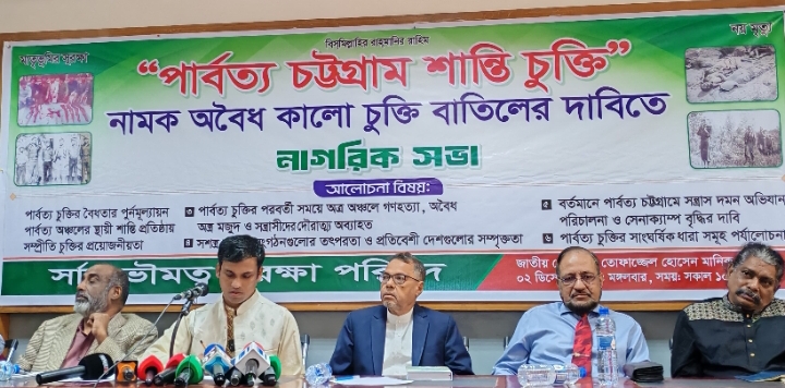 প্রেস বিজ্ঞপ্তি: “পার্বত্য চট্টগ্রাম শান্তি চুক্তি” নামক অবৈধ কালো চুক্তি বাতিলের দাবিতে আজ ০২ ডিসেম্বর মঙ্গলবার সকাল ১০টায় জাতীয় প্রেসক্লাবের তোফাজ্জল হোসেন মানিক মিয়া(ভিআইপি) হলে সার্বভৌমত্ব সুরক্ষা পরিষদ এর উদ্যোগে নাগরিক সভা অনুষ্ঠিত হয়।