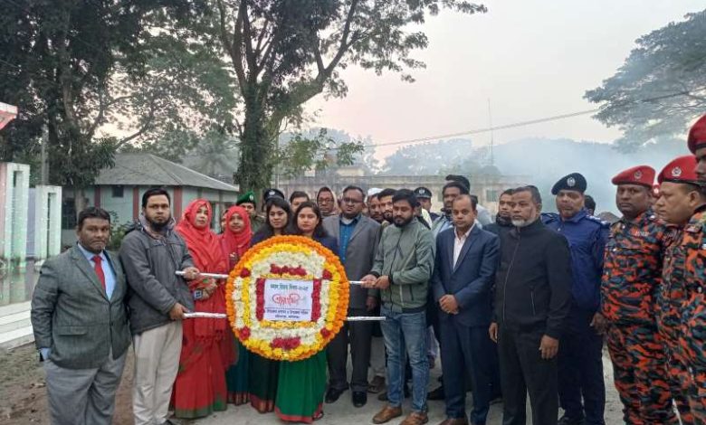 ১৬ ডিসেম্বর মঙ্গলবার প্রত্যুষে ৬.৩০ ঘটিকায় উপজেলা চত্ত্বরে প্রথমে তোপধ্বনির মাধ্যমে ও শহীদ মিনারে পুষ্প অর্পণ এবং শ্রদ্ধা নিবেদন করা হয়।