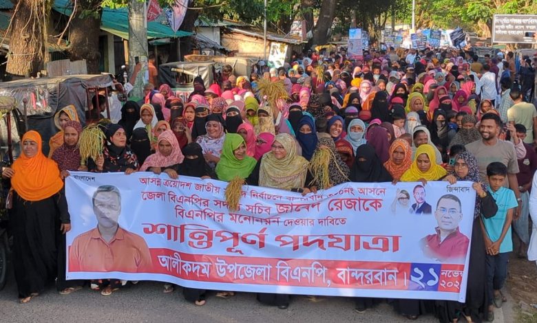 বান্দরবান প্রতিনিধি: বান্দরবানের আলীকদম উপজেলায় জেলা বিএনপির সদস্য সচিব ও সাবেক পৌরসভার মেয়র মো. জাবেদ রেজাকে ৩০০-নং সংসদীয় আসনে ধানের শীষ প্রতীকের মনোনয়ন প্রদানের দাবিতে পদযাত্রা অনুষ্ঠিত হয়েছে। শুক্রবার (২১ নভেম্বর) বিকেলে আলীকদম উপজেলা বাজারে বিএনপির ব্যানারে কয়েক হাজার পাহাড়ি–বাঙালি মানুষের অংশগ্রহণে এ কর্মসূচি পালিত হয়।