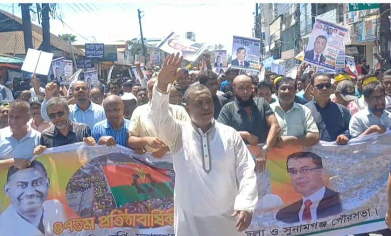 আজ বুধবার দুপুরে সুনামগঞ্জ সদর উপজেলা বিএনপির আয়োজনে শহরের পুরাতন বাসস্টেশন এলাকায় বিএনপির কার্যালয়ের সামনে থেকে লোকে লোকরন্য হয়ে একটি বিশাল জনতার মিছিল বের হয়ে শহরের বিভিন্ন সড়ক প্রদক্ষিণ শেষে পুনরায় বিএনপির কার্যালয়ের সামনে এসে এক আলোচনা সভা অনুষ্ঠিত হয়।