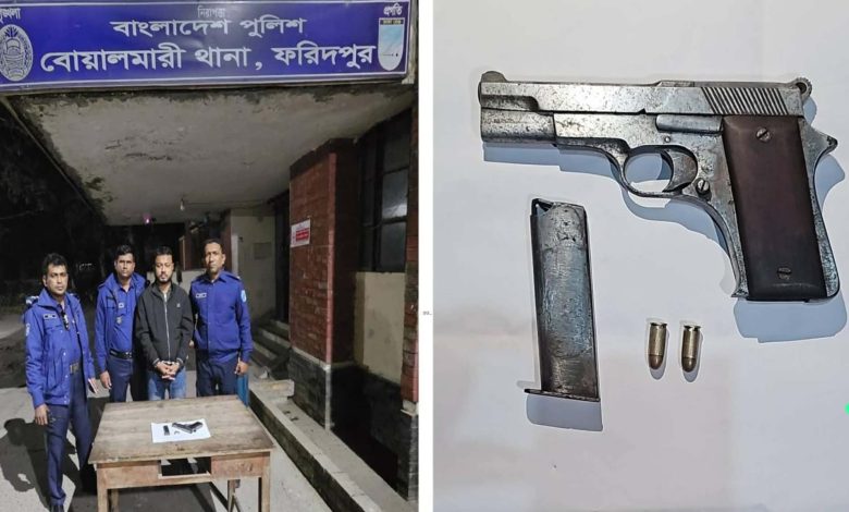 বোয়ালমারী (ফরিদপুর) প্রতিনিধি : ফরিদপুরের বোয়ালমারী উপজেলায় সেনাবাহিনী ও পুলিশের যৌথ অভিযানে অবৈধ আগ্নেয়াস্ত্রসহ মাহবুবুর রহমান সজীব (৩১) নামে এক যুবদল নেতাকে আটক করা হয়েছে। এ সময় তার কাছ থেকে একটি ৭.৬৫ মি.মি. পিস্তল, একটি ম্যাগাজিন ও দুই রাউন্ড তাজা গুলি উদ্ধার করা হয়।