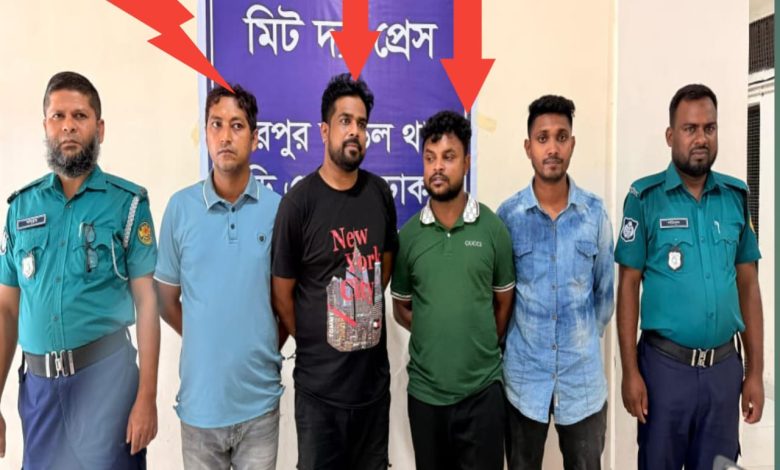 মিরপুর মডেল থানা সূত্রে জানা যায়, রোববার (৬ জুলাই) রাত আনুমানিক ১০টায় গ্রেফতারকৃত চারজনসহ অজ্ঞাতনামা ৮/১০ জন পশ্চিম মনিপুরের প্রতিক ভিলা নামক একটি বাসায় হামলা করে। ওই বাসায় বসবাসরতদের জিম্মি করে আওয়ামী লীগের ফ্যাসিস্ট বলে ২০ লক্ষ টাকা চাঁদা দাবি করে। তারা বিভিন্ন উপায়ে তাদেরকে পাঁচ লক্ষ টাকা প্রদান করে। ঘটনা চলাকালিন রাত আনুমানিক ০৩টার সময় পুলিশ ও র্যাবের উপস্থিতি টের পেয়ে হামলাকারীরা পালানোর চেষ্টা করলে পুলিশ ঘটনাস্থল হতে চারজনকে গ্রেফতার করে। গ্রেফতারের সময় তাদের হেফাজত হতে আদায়কৃত চাঁদার ১৬ হাজার টাকা ও তাদের ব্যবহৃত একটি মোটরসাইকেল জব্দ করে।