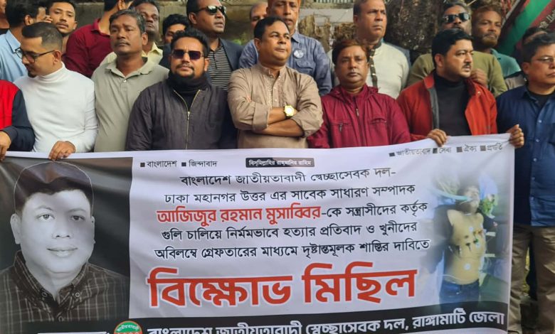 শনিবার বিকালে রাঙামাটি জেলা স্বেচ্ছাসেবক দলের উদ্যোগে আয়োজিত বিশাল বিক্ষোভ মিছিল ও প্রতিবাদ সমাবেশ থেকে এক সুরে দাবি উঠেছে খুনিদের অবিলম্বে গ্রেপ্তার করে দৃষ্টান্তমূলক শাস্তি দিতে হবে, নতুবা কঠোর আন্দোলনে অচল করে দেওয়া হবে দেশ। সকাল থেকেই রাঙামাটি শহরের বিভিন্ন প্রান্ত থেকে ব্যানার-ফেস্টুন নিয়ে খণ্ড খণ্ড মিছিল সহকারে নেতাকর্মীরা জেলা বিএনপি কার্যালয়ের সামনে জড়ো হতে থাকেন। সেখান থেকে এক বিশাল বিক্ষোভ মিছিল শুরু হয়। মিছিলটি শহরের প্রধান সড়কগুলো প্রদক্ষিণ করার সময় নেতাকর্মীদের গগনবিদারি শ্লোগানে মুখরিত হয়ে ওঠে রাজপথ। ‘মুসাব্বির ভাইয়ের রক্ত, বৃথা যেতে দেবো না’—এই দৃপ্ত স্লোগানে সাধারণ মানুষের মধ্যেও সংহতি লক্ষ্য করা যায়।মিছিল শেষে এক বিশাল প্রতিবাদ সমাবেশ অনুষ্ঠিত হয়।