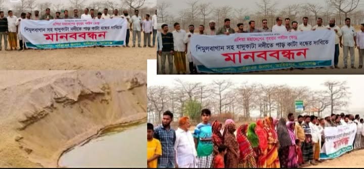 বৃহস্পতিবার দুপুর সুনামগঞ্জের তাহিরপুর উপজেলার বাদাঘাট ইউনিয়ন যাদুকাটা নদী সংলগ্ন এশিয়ার বৃহত্তর শিমুল বাগানের সামনে স্থানীয় এলাকাবাসীর আয়োজনে এই মানববন্ধন অনুষ্ঠিত হয়।