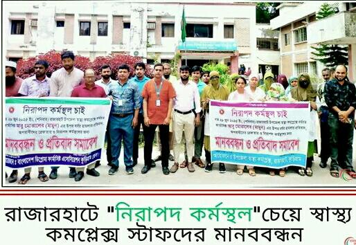 এ আর লিমন, কুড়িগ্রাম প্রতিনিধি : সোমবার (৩০ জুন) সময় সকাল ১১ ঘটিকায় রাজারহাট উপজেলা স্বাস্থ্য কমপ্লেক্স ভবন চত্বরে স্টাফদের অংশগ্রহণে এ মানববন্ধন ও প্রতিবাদ সমাবেশ অনুষ্ঠিত হয়।