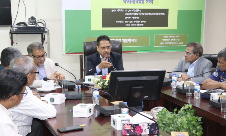 ১৭ জুলাই রাজধানীর রেলভবনে বৃস্পতিবার সকাল ১০:৩০ মিনিটে রেলপথ মন্ত্রণালয়ের সচিব মোঃ ফাহিদুল ইসলামের সভাপতিত্বে ও বাংলাদেশ রেলওয়ের মহাপরিচালক মোঃ আফজাল হোসেনসহ উচ্চ পদস্থ কর্মকর্তাদের উপস্থিতিতে আয়োজিত এক মতবিনিময় সভায় রেলপথ মন্ত্রণালয়ের জন্য প্রধান উপদেষ্টার বিশেষ সহকারী ড. শেখ মইনউদ্দিন অত্যন্ত গুরুত্বপূর্ণ একটি বক্তব্য রাখেন। তিনি বলেন, দেশের যোগাযোগ ব্যবস্থা উন্নয়নের জন্য সড়ক, নৌ ও রেল যোগাযোগের সমন্বয়ে একটি দীর্ঘমেয়াদি মহাপরিকল্পনা প্রয়োজন। তিনি স্বীকার করেন, যেখানে বিশ্বের উন্নত দেশগুলোতে ৩০-৩৫ শতাংশ যাত্রী ও পণ্য পরিবহন হয় রেলের মাধ্যমে, সেখানে বাংলাদেশে পণ্য পরিবহনের হার মাত্র ২ শতাংশ।