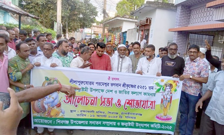 এদিকে উপজেলা জন্মাষ্টমী উদযাপন কমিটির ব্যানারে শিবগঞ্জ কেন্দ্রীয় রাধাগোবিন্দ মন্দির প্রাঙ্গণ থেকে একটি শোভাযাত্রা বের হয়ে গুরুত্বপূর্ণ সড়ক প্রদক্ষিণ শেষে পুনরায় সেখানে গিয়ে আলোচনা সভা মিলিত হয়। উপজেলা জন্মাষ্টমী উদযাপন কমিটির আহবায়ক কমল কুমার ত্রিবেদীর সভাপতিত্বে প্রধান অতিথি ছিলেন শিবগঞ্জ পৌর বিএনপির আহবায়ক সফিকুল ইসলাম। এতে আরো উপস্থিত ছিলেন উপজেলা জন্মাষ্টমী উদযাপন কমিটির উপদেষ্টা সাধন কুমার মনিগ্রাম, সদস্য গণপতি বারি, উপজেলা বিএনপির সাবেক সাংগঠনিক সম্পাদক সাব্বির আহমেদ, বিএনপি নেতা আব্দুল আহাদ ও যুবনেতা শামিউম বাসার রাজাসহ অন্যরা।