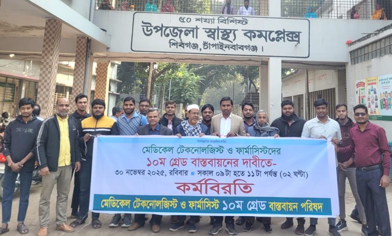 মেডিকেল টেকনোলজিস্ট ও ফার্মাসিস্টরা বলেন, গত এক বছর ধরে আবেদন, স্মারকলিপি, বৈঠক, যুক্তি-তথ্য-পরিসংখ্যানসহ সব আনুষ্ঠানিক প্রক্রিয়া অনুসরণ করেও তাদের ১০ম গ্রেড বাস্তবায়নের দাবি উপেক্ষিত হচ্ছে। মাত্র বছরে ২৪ কোটি টাকার আর্থিক বরাদ্দে দীর্ঘ তিন দশকের পেশাগত অর্জনকে মর্যাদায় উন্নীত করা- এ দাবি ন্যায়সংগত ও সময়োপযোগী।