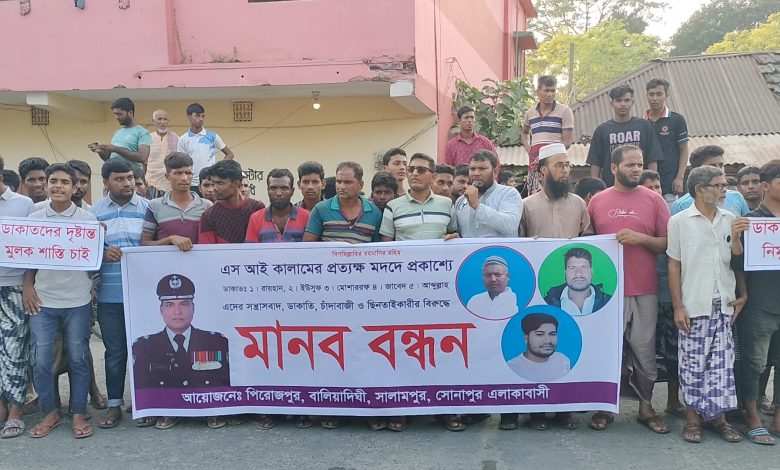 ঘণ্টাব্যাপী এই মানববন্ধনে অংশ নেন মোতালেব আলী, পলাশ মিয়া বাবুল, ইউসুফ আলীসহ কয়েকশ’ স্থানীয় নারী-পুরুষ। মানববন্ধনে বক্তারা অভিযোগ করেন, সোনাপুর গ্রামের লুতফলের ছেলে এসআই কালামের ছত্রছায়ায় রায়হান, ইউসুফ,মোশাররফ, জাবেদ ও আব্দুল্লাহ নামের একটি চক্র দীর্ঘদিন ধরে এলাকায় সন্ত্রাস, ডাকাতি, চাঁদাবাজি ও ছিনতাইয়ের মাধ্যমে ত্রাস সৃষ্টি করছে। বক্তারা আরও বলেন,এই চক্রের হাতে সাধারণ মানুষ প্রতিনিয়ত নির্যাতনের শিকার হচ্ছে। তাদের বিরুদ্ধে মামলা হলেও রহস্যজনক কারণে আইনশৃঙ্খলা বাহিনী কোনো পদক্ষেপ নিচ্ছে না। তারা দাবি জানান, দ্রুত এসব অপরাধীদের গ্রেপ্তার করে আইনের আওতায় আনা হোক এবং নিরীহ মানুষকে রক্ষা করা হোক। মানববন্ধনে বক্তারা সরকারের কাছে জোর দাবি জানান— এলাকায় শান্তি-শৃঙ্খলা ফিরিয়ে আনতে দোষীদের কঠোর শাস্তি দিতে হবে এবং পুলিশের ভেতরে থাকা দুর্নীতিবাজদের বিরুদ্ধেও ব্যবস্থা নিতে হবে।