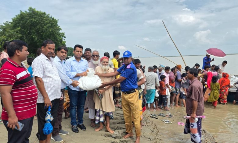শিবগঞ্জ (চাঁপাইনবাবগঞ্জ) প্রতিনিধি: চাঁপাইনবাবগঞ্জের শিবগঞ্জে বানভাসী সাত শতাধিক পরিবারের মাঝে ত্রাণসামগ্রী বিতরণ করা হয়েছে। সোমবার দুপুরে উপজেলা প্রশাসনের আয়োজনে উপজেলার চর পাঁকা এলাকায় বানভাসীদের মাঝে এসব ত্রাণসামগ্রী বিতরণ করেন উপজেলা নির্বাহী কর্মকর্তা মো. আজাহার আলী। এ সময় স্বাস্থ্যসেবা ও ভেটেরিনারি ক্যাম্প স্থাপন করে বিনামূল্যে ওষুধ ও স্বাস্থ্য পরামর্শ প্রদান করা হয়। পাশাপাশি উপজেলা সমাজসেবা কার্যালয়ের আওতায় বিভিন্ন ভাতাভোগীদের নিকট ভাতার নগদ টাকা তুলে দেয়া হয়। এ সময় উপস্থিত ছিলেন উপজেলা প্রাণিসম্পদ কর্মকর্তা ডা. শাহাদৎ হোসেন, উপজেলা প্রকল্প বাস্তবায়ন কর্মকর্তা মিজানুর রহমান ও পাঁকা ইউনিয়ন পরিষদ চেয়ারম্যান আবদুল মালেকসহ অন্যরা। এর আগে উপজেলা প্রশাসনের পক্ষ থেকে কয়েক দফায় বাসভাসীদের মাঝে চাল ও শুকনো খাবারসহ ত্রাণসামগ্রী দেয়া হয়।
