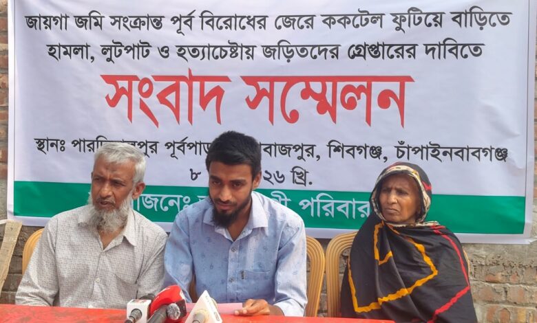 রোববার বিকেলে জেলার শিবগঞ্জের পারদিলালপুর পূর্বপাড়া এলাকায় আয়োজিত সংবাদ সম্মেলনে এই অভিযোগ করেন ভুক্তভোগী পরিবারের সদস্য আসমাউল হুসনা। তিনি জানান, সম্প্রতি প্রতিপক্ষের লোকজন তাদের বাড়িতে হামলা চালায়। এ সময় দুটি ককটেল বিস্ফোরণ ঘটিয়ে বাড়িঘরে লুটপাট করা হয়। এছাড়া প্রাণনাশের হুমকি দেয়া হয় বলেও অভিযোগ করেন তিনি। ঘটনার সঙ্গে জড়িতদের আইনের আওতায় আনার দাবি জানান। সংবাদ সম্মেলনে উপস্থিত ছিলেন তাজকেরা বেগম, মোজাম্মেল হক, শহিদুল ইসলামসহ অন্যরা।
