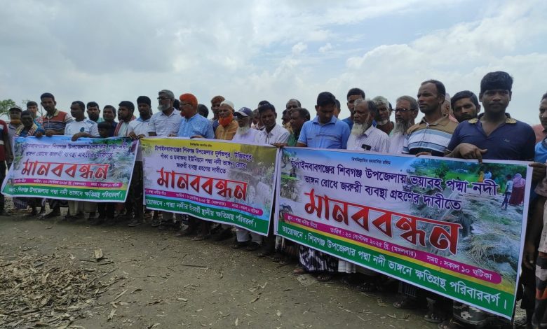 শিবগঞ্জে ভয়াবহ নদী ভাঙন রোধে জরুরী ব্যবস্থা গ্রহণের দাবীতে মানববন্ধন