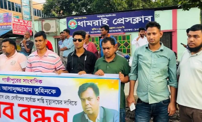 ধামরাই (ঢাকা) প্রতিনিধি: গাজীপুরে দৈনিক প্রতিদিনের কাগজের সাংবাদিক আসাদুজ্জামান তুহিনকে হত্যার প্রতিবাদে বিচার চেয়ে মানববন্ধন করেছে ধামরাই প্রেসক্লাবের সাংবাদিকসহ স্থানীয় সাংবাদিকরা।