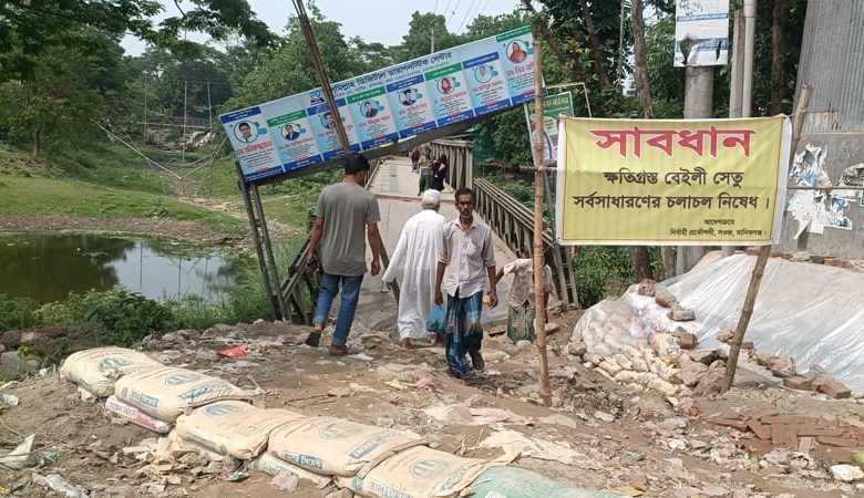 জানা গেছে, গাজীখালী নদীর ওপর ২০১৩ সালে একটি সেতুর নির্মাণকাজ শুরুর তিন মাস আগে বিকল্প বেইলি সেতু নির্মাণ করা হয়। ২০১৫ সালের ১৫ অক্টোবর জনসাধারণের জন্য নতুন সেতু খুলে দেওয়া হয়। এ সময় সড়ক ও জনপথ (সওজ) বিভাগ বেইলি সেতুটি অপসারণ করেনি। ১২ বছরে সংস্কার না করায় সেতুটির এখন ভগ্নদশা। গত সপ্তাহে কয়েক দিনের বৃষ্টির পর সেতুটি হেলে পড়ে। এর পর মানিকগঞ্জ সওজ কর্তৃপক্ষ একটি সাইনবোর্ড দিয়ে দায় সারে। সাইনবোর্ডে লেখা ‘সাবধান, ক্ষতিগ্রস্ত বেইলি সেতু, সর্বসাধারণের চলাচল নিষেধ।’ তবু ঝুঁকি নিয়ে এ সেতু দিয়ে প্রতিদিন হাজারো মানুষ চলাচল করছে।