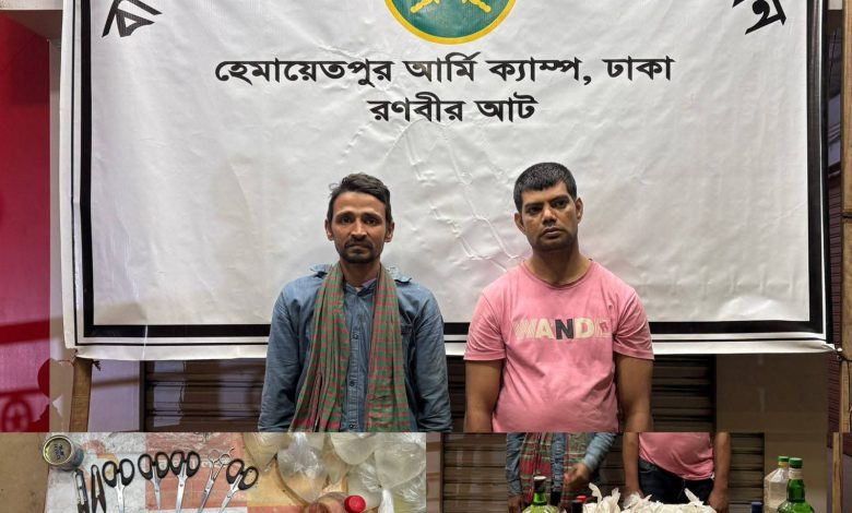 গ্রেপ্তারকৃতরা হলেন-ঢাকা জেলার হেমায়েতপুর বাসস্ট্যান্ড পাড়া এলাকার কথিত শীর্ষ মাদক ব্যবসায়ী মোস্তফার ছেলে ফিরোজ ওরফে গুটি ফিরোজ (৩৫) এবং দিনাজপুর জেলার সদর থানার মধ্য বালুবাড়ী এলাকার আজিজুল ইসলামের ছেলে সুজন (৩২)। গ্রেপ্তারকৃতদের বিরুদ্ধে ধর্ষণ, পর্নোগ্রাফি, মাদক, ছিনতাইসহ অন্তত ১৭ টি মামলা রয়েছে।