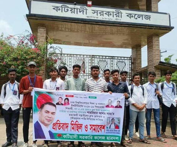 রতন ঘোষ, কটিয়াদী প্রতিনিধি: কিশোরগঞ্জের কটিয়াদীতে ঢাকা বিশ্ববিদ্যালয়ের শিক্ষা ও গবেষণা ইনস্টিটিউটের ২৫ তম ব্যাচের শিক্ষার্থী ও ছাত্রদল নেতা শাহরিয়ার আলম সাম্য হত্যার বিচার দাবিতে কটিয়াদী সরকারি কলেজ শাখার ছাত্রদলের উদ্যোগে প্রতিবাদ মিছিল ও সমাবেশ অনুষ্ঠিত হয়েছে।