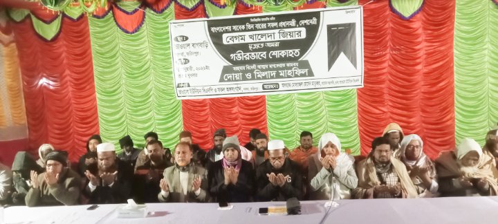 বিধান মন্ডল (ফরিদপুর) প্রতিনিধি: ফরিদপুরের সালথায় বাংলাদেশের সাবেক তিন বারের সফল প্রধানমন্ত্রী, দেশনেত্রী বেগম খালেদা জিয়া’র বিদেহী আত্মার মাগফেরাত কামনায় দোয়া ও মিলাদ মাহফিল অনুষ্ঠিত হয়েছে। বুধবার (৭ জানুয়ারি) সন্ধ্যা ৭ টায় বিএনপি নেতা জাহিদ হোসেন ও রাশেদ মাতুব্বরের আয়োজনে উপজেলার ভাওয়াল ইউনিয়নের ভাওয়াল বাগবাড়ি হাজী বাড়ি প্রাঙ্গণে এই দোয়া ও মিলাদ মাহফিল অনুষ্ঠিত হয়। দোয়া ও মিলাদ মাহফিলের আগে বেগম খালেদা জিয়া’র জীবনীর উপর সংক্ষিপ্ত আলোচনা সভা অনুষ্ঠিত হয়।